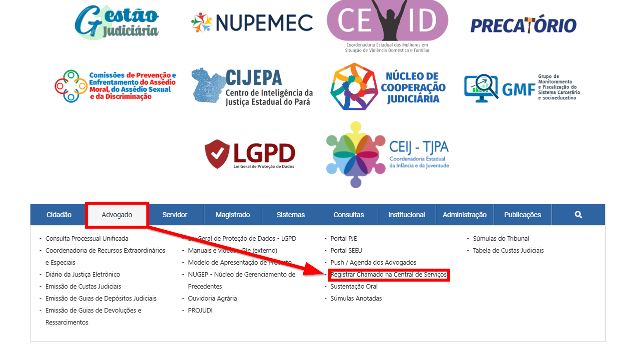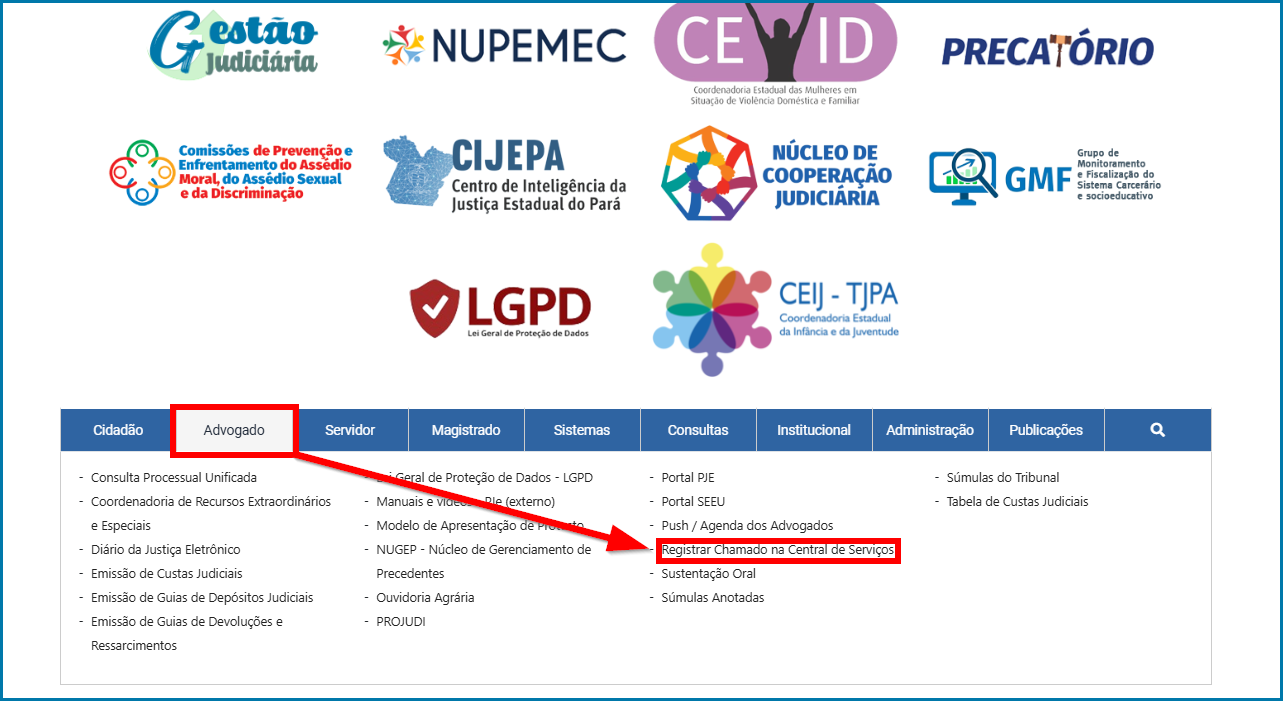 ConteúdoPROCEDIMENTO PARA ABERTURA DE CHAMADOS TÉCNICOS POR ADVOGADOS E PÚBLICO EXTERNODescrição: Este documento tem como objetivo orientar advogados e outros interessados no procedimento correto para abertura de chamados na Central de Serviços do TJPA.Público-Alvo: Advogado e Público Externo.Passo a passo: