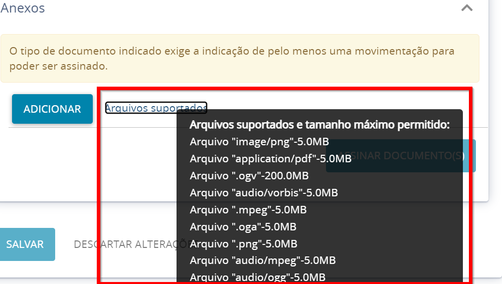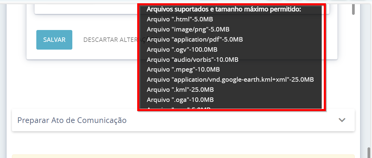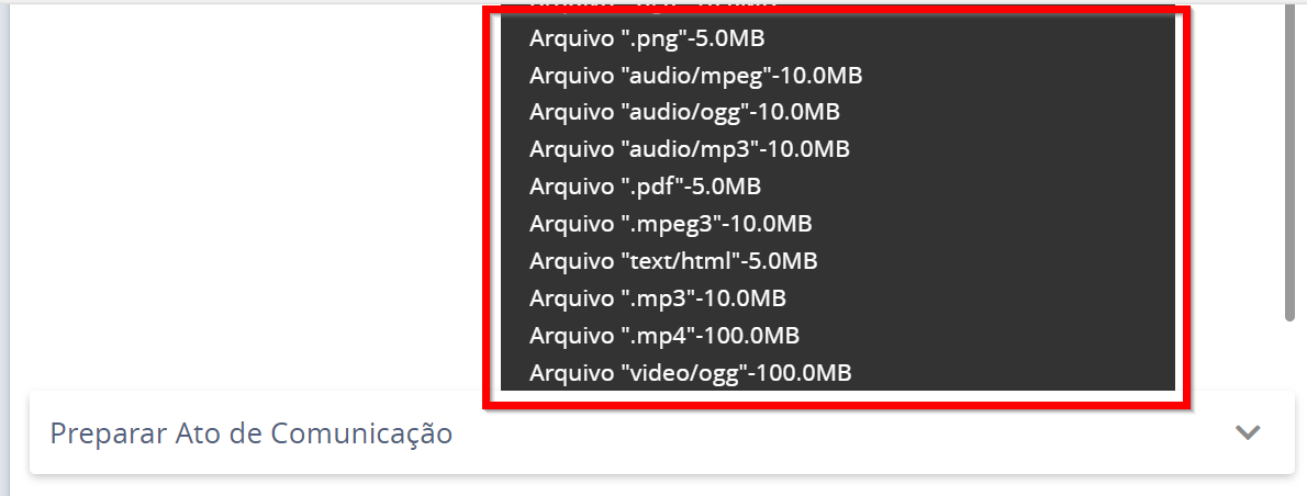 4. Erro ao anexar o arquivo ('XXXXX.pdf'): Tipo 'binary/octet-stream' inválido.5. Arquivos Suportados e Tamanho Máximo Permitido: