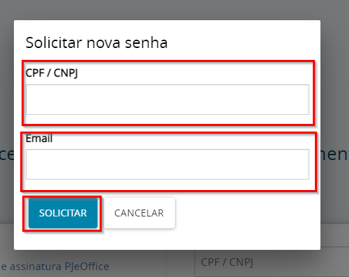 Para cadastrar a senha, clique em "Solicitar nova senha" na tela de login do PJe, informe o CPF/CNPJ (apenas números) e o e-mail cadastrado no sistema, e clique em "Solicitar".